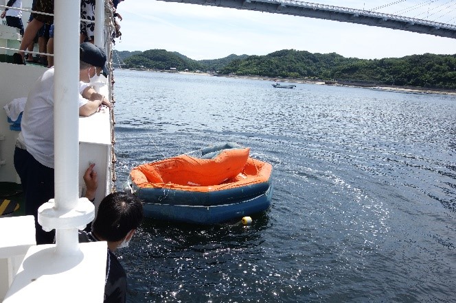 膨張式救命筏を実際に使用している様子