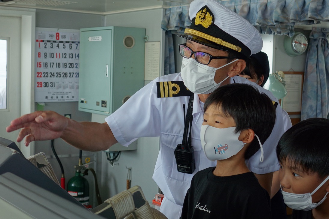 ブリッジで操船を体験する子ども
