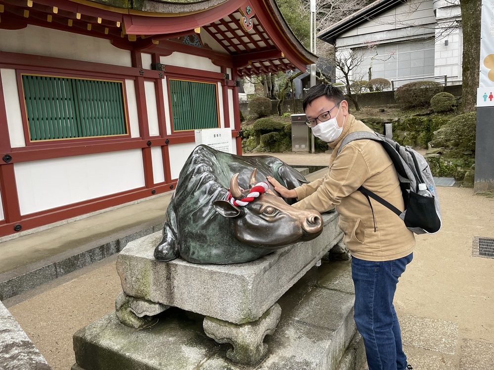 御神牛に触れる留学生
