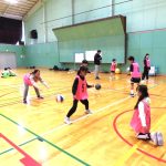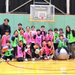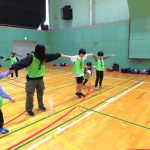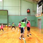 次に、フットワークとボールコントロールを意識しながらボール集めや手つなぎジグザグドリブル、色々なパス練習など楽しみながらバスケットボールの技術を学びました。